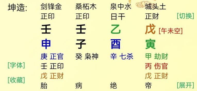 我坐下的酉金是七杀,杀也去生了印,说明我很有能力有手段。本来我杀印相生挺好的,但是我时干透了戊土,家里的财去制了印,财坏印起了坏作用,说明我没有学历,学历不是初高中就是中专。年月的印很旺,母亲非常强势脾气很差,父母的关系也不好,父亲是比较弱势,戊土的人也老实。此造的贵点在印禄相随,外面的印来生了我家里的禄,就说明我不做,也有人来养我,一般的人还没有这个命,靠男人靠不住。那么是谁来养着我?子水是申酉官杀生的,说明有男人养我,给我钱花。我用禄去取时上的戊财,用身体去取这个财。