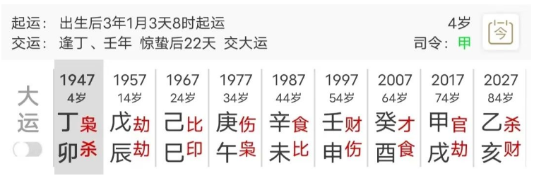 大运:丁卯、戊辰、己巳、庚午、辛未、壬申、癸酉、甲戌。