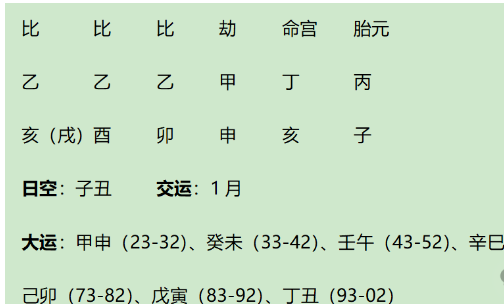 甲申运(1223-1232),甲劫透而生食伤,申合子而助印;食伤、印得助,则是有助于于能力、孝心。