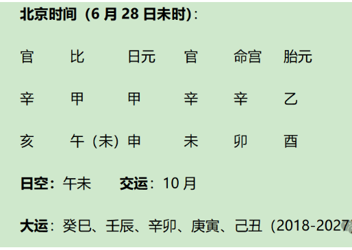算命一条街最准网站测八字算命当地时间八字此年为:辛卯运、壬午年、小限癸亥。此运,卯合日支申;此年,午、亥与时支辰无任何刑冲合害,时支子女宫不动。不符合事实,因此排除。