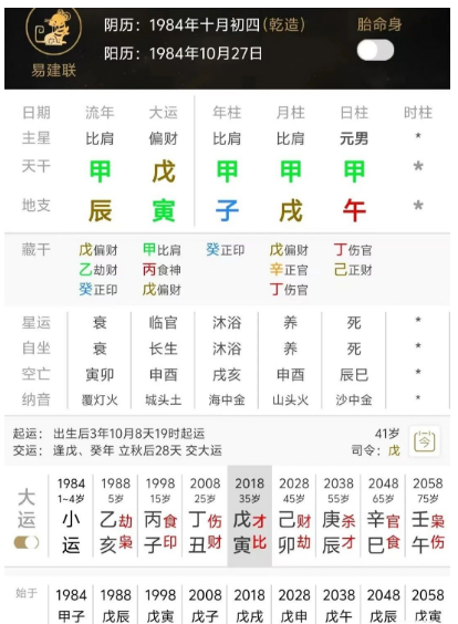将84年的八字排出来我们再看,天干三个甲木,大的格局走向好歹也算“三甲天上贵”。