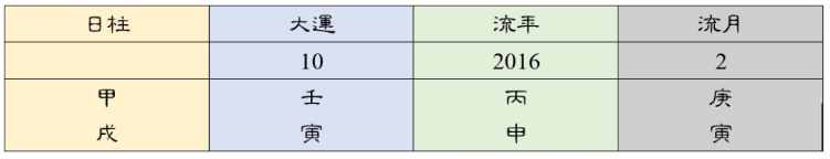 作者说:「甲木单吊无壬水护卫,现正在走寅木大运,极怕庚金、申金七杀进气的流年、流月、流日,每逢此气场,不是感冒、免疫力下降,就是跌倒、摔车、骨折、筋骨挫伤。他目前走寅木大运,从去年(二零一五)八月申金进气,内人总是不断叮嘱提醒他注意安全。」(《科学论八字》,P.242。)
